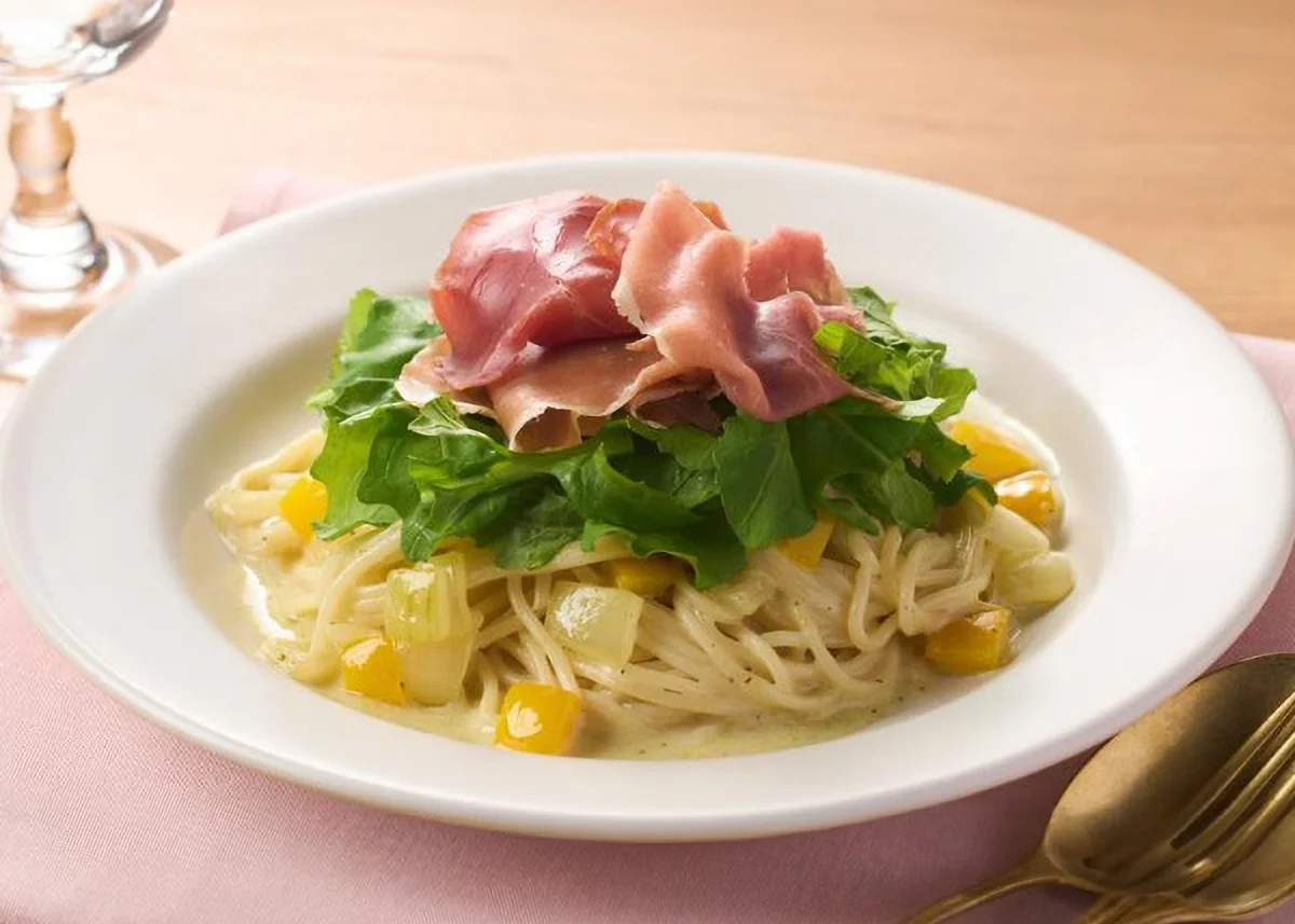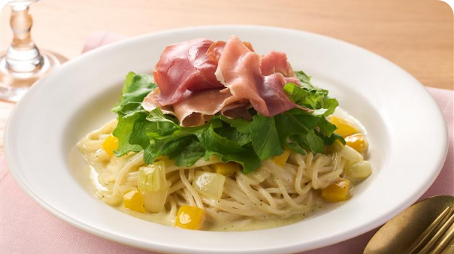 生ハムとルッコラの組み合わせが新鮮な、サラダ感覚のパスタ。ハーブクリームの爽やかなコクで、つるっと食べられます。