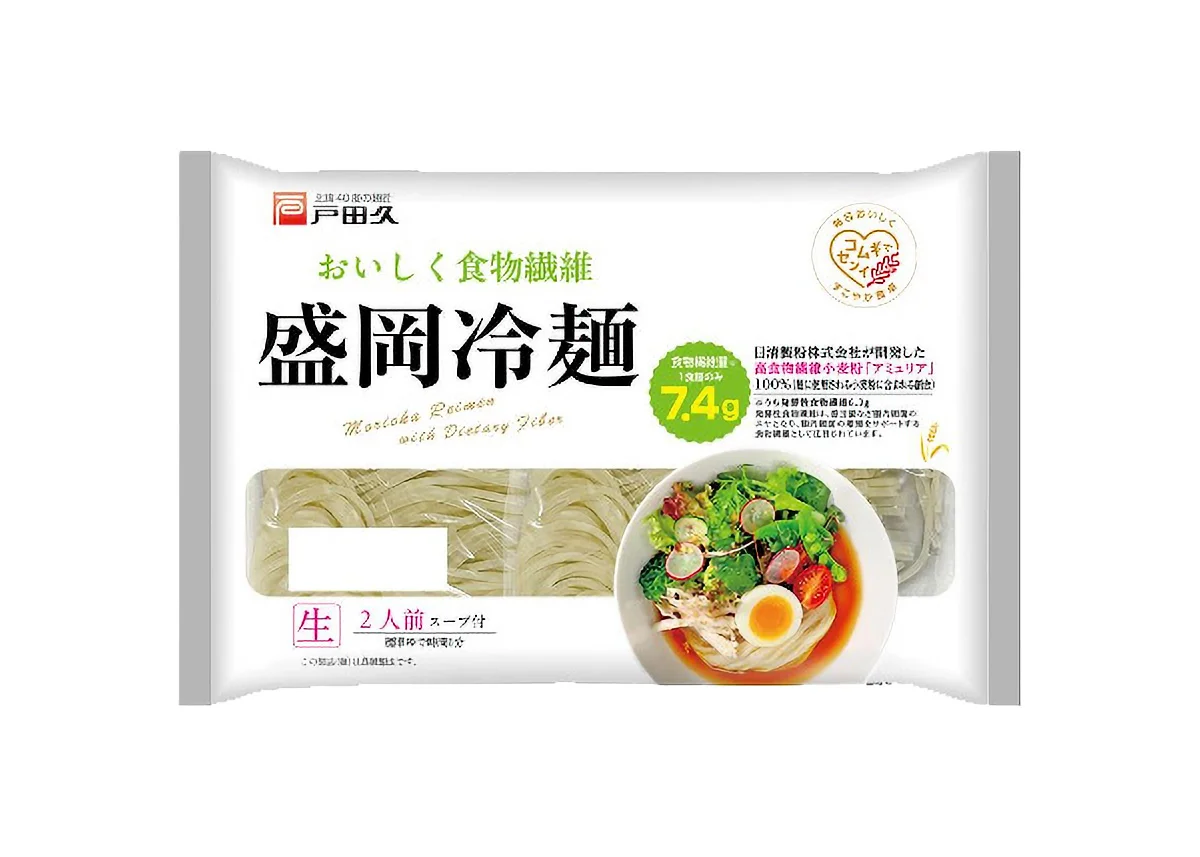 清涼感あふれる一杯「おいしく食物繊維盛岡冷麺」は、高食物繊維小麦粉「アミュリア」100%使用で1食あたり7.4g(麺のみ)の食物繊維を摂取可能。