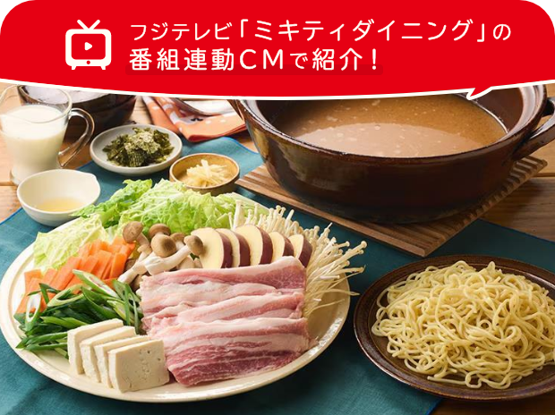 にんにくがきいた味噌スープに豆乳を合わせ、まろやかなスープで豚肉とたっぷりの野菜を楽しめます。スープにしょうがやレモンを加えると、さわやかな味わいに変化!〆には麺を加えてスープとよくからめ、海苔を散らしてお召し上がりください。